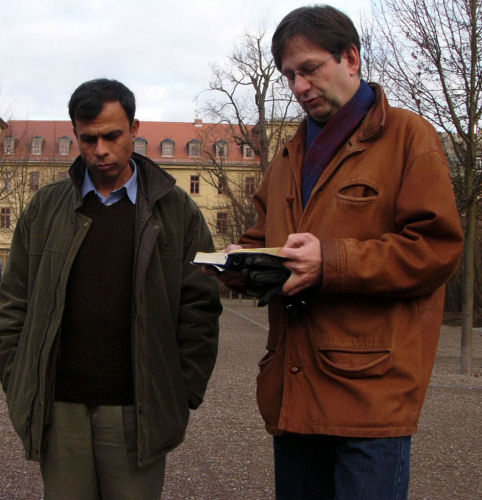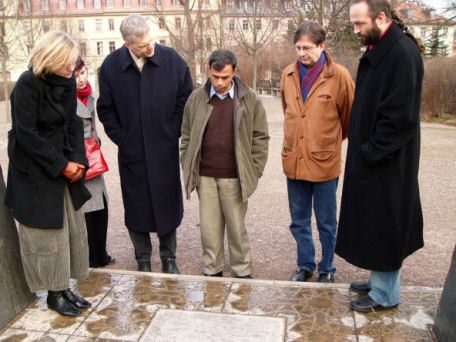 Herr Hemajatullah liest die Hafis-Verse auf der Bronzeplatte vor, die sich